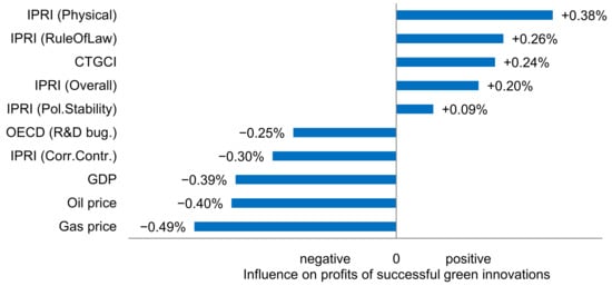 Economic factors, e.g., higher prices for oil and gas significantly affect green innovation returns, as previously reported by [32]. The findings for coal are mixed and not significant. Larger gross domestic products negatively affect the returns, while there are mixed findings for related per capita values. Previous studies find a positive relationship between R&D expenses and green innovation activity (measured in the number of patents) [31]. However, we do not observe that larger total R&D spending in an economy results in higher green innovation returns. As most studies before focus on the early stage of innovation, the positive relationship of rising prices for conventional (fossil) resources is obvious, because it incentivizes research on alternative technologies. For the later stage of innovation, however, competition is counterproductive for market participants, as successful green innovation commercialization takes place in a narrow win–win area caused by higher uncertainty for green innovations [2,10].