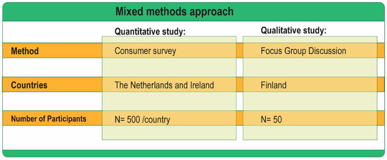 In social research, like in any qualitative research, it is common to build an investigation phase in order to develop a better understanding of the broader context together with the social ecology participants [4,5]. Geels (2011) has proposed creating a practical sustainability framework when studying new socio-technical innovations in any regime shift in order to sketch out the most important dimensions of the related issue and help to specify the types of questions that should be asked from the participants in the transition area [29]. The practical sustainability framework within the social research context falls under Value Sensitive Design, which is a theoretically grounded approach to the design of technology that accounts for human values [30,31]. In addition, the framework is built upon the Theory of Planned Behavior [32], which focuses on the attitudes towards the perception of a product. The hypothesis was to study the ethical values, subjective norms, attitudes, and behavioral intentions towards BBP of the regional study stakeholders as thoroughly as possible within the limitations of the study setup. In this context, the emphasis on capturing consumer feedback depends highly on community acceptance, which Huijts et al. (2011) label as citizen acceptance [33]. This refers to the behavioral responses within communities that are affected by the placement of a technological object close to home. In more detail, the framework applied mixed methods, as it is acknowledged that combining both qualitative and quantitative research methods in a social context can provide broader understanding of the topic [4], see Figure 1. This article limits itself to the qualitative case study that was organized with 50 consumers in Finland. The results from the quantitative part of the framework, conducted in Ireland and the Netherlands, are published by Gaffey et al. [6]. The sustainability framework encompassing the nominated three EU countries was developed for explicitly investigating customer perception of BBPs and brands.