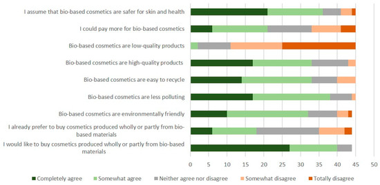 Consumers generally felt that bio-based cosmetics were safer for skin and health (36), and they would like to buy cosmetics produced wholly or partly from bio-based materials (40) (see Figure 5). Consumers also felt that bio-based cosmetics were environmentally friendly (32), less polluting (38), and easy to recycle (38). Only 18 consumers stated that they already preferred to buy bio-based cosmetics. In general, the participants felt that bio-based cosmetics were high-quality products (33). About half of the consumers (21) would pay more for cosmetic products packed in bio-based alternatives.