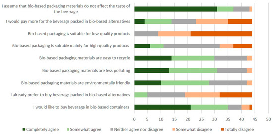 Generally, related to bio-based food packaging materials, consumers felt that bio-based packaging does not affect the taste of the food inside (43), and they would like to buy products in bio-based packages (44) (see Figure 4). In addition, the consumers felt that bio-based packaging materials were environmentally friendly (41), less polluting (39), and easy to recycle (37). Most consumers (37) stated that they already preferred to buy food products wrapped in bio-based alternatives. Only 15 of the consumers were willing to pay more for the food products packed in bio-based materials.