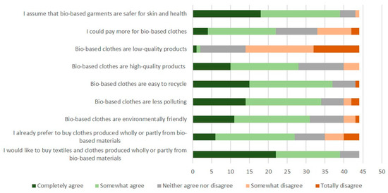 In general, consumers felt that bio-based garments are safer for skin and health (39), and they would like to buy textiles and clothes produced wholly or partly from bio-based materials (39/44) (see Figure 7). Consumers also felt that bio-based clothes were environmentally friendly (31), less polluting (34), and easy to recycle (37). More than half (27) stated that they already preferred to buy clothes produced wholly or partly from bio-based materials. They felt that bio-based clothes were high-quality products (28). Only half of the respondents (22) would be willing to pay more for bio-based clothes.