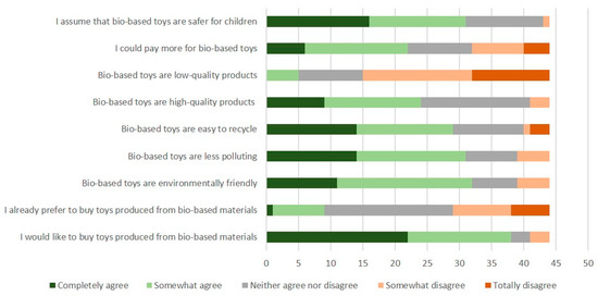 In general, the consumers felt that the bio-based toys were safer for children (31) and they would like to purchase toys produced from bio-based materials (38) (see Figure 8). The participants felt that bio-based toys were environmentally friendly (32), less polluting (31), and easy to recycle (29). Only nine stated that they already preferred to buy toys produced from bio-based materials. They felt that bio-based toys were high-quality products (24). Half of the respondents (22) stated that they would pay more for bio-based toys.