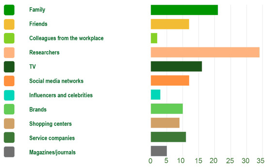 Out of 11 predefined categories (the participants were able to choose any number of options; total responses n = 136), the most influential media or social connection from which the participants preferred to receive or share information about the BBP were researchers (34), family (21), and television (16) (see Figure 10). The consumers felt that “Fact-based knowledge and research data is the most reliable source of information”; some preferred newspaper articles. Consumers also pointed out the importance of information being easily available: “Information should be easily available, even when one is not specifically pursuing it”. Social media was pointed out as being influential and visible: “I react mostly to social media”. Some consumers felt that the advertisements (from different media sources) were more appealing, although others mentioned that they were not able to trust those at all. As for BBP, consumers were keen to discuss the issues with their families and friends.