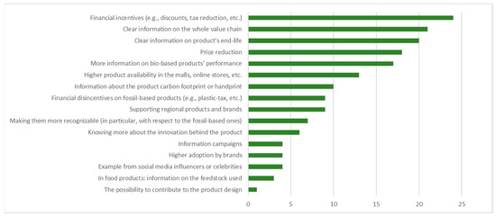 The Finnish participants (n = 44) felt that they were going to buy more bio-based products (41) and more products packaged in bio-based materials (43) in the future. Consumers felt that financial incentives (25), clear information about the entire value chain (21), and the product’s end-life (20) were among the most important motivational factors affecting future behavior toward bio-based products (see Figure 11). They were less motivated from the possibility to contribute to the product design (1), information on the feedstock used in food products (3), higher adoption by brands (4), information campaigns (4), and example from social media influencers or celebrities (4).
