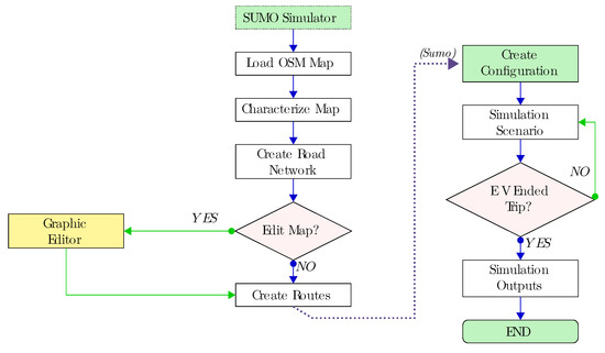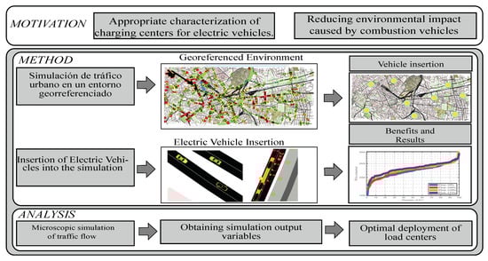 The large-scale use of EVs in cities with a remarkable traffic load will undoubtedly increase the partial traffic pressure and load; therefore, the planning of CCEV based on traffic flow will be more practical. The continuous driving capability of the EV must be protected; the simulation considers significant variables such as traffic flow, vehicle types, traffic lights, and intersections. Then, the principal idea is that the simulation is as realistic as possible in the chosen site, which has been executed with SUMO for the traffic and OSM for the geo-referenced map.