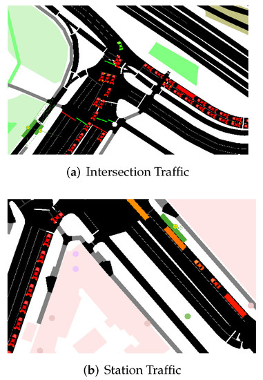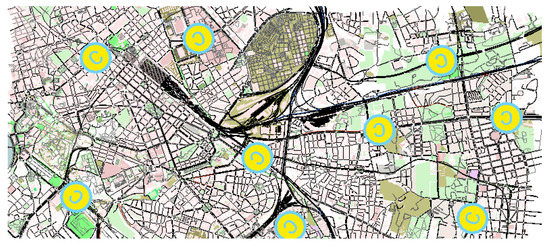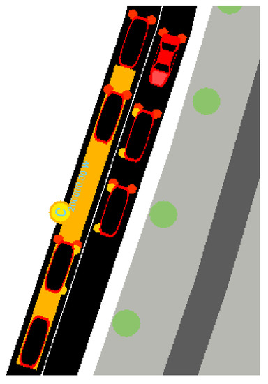Figure 5 shows the deployment of the CCEV within the simulation in a geo-referenced environment; it is observed that the moment in which the EVs are charging, the EVs have an average maximum mileage of 150–400 km, taking into account that the charging need is less than 20% of the maximum power and considering the traffic obstruction, as well as the battery capacity margin. The factors mentioned above were taken into account to identify the most relevant variables involved in an urban traffic simulation in a geo-referenced environment for the following location of CCEV.