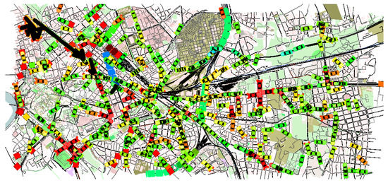 Figure 14 show the evaluation to which CCEV 1 was subjected, which is located on the left side of the study area whose coordinates are x:2491.96, y:6742.48 | lat:41.901316, lon:12.494034. Therefore, these coordinates can locate the same site within the city under study. Such placement is represented in