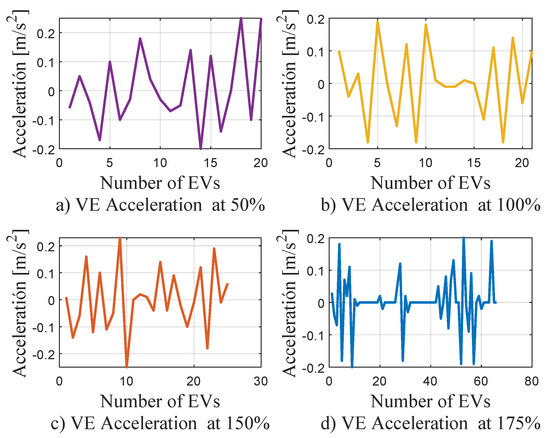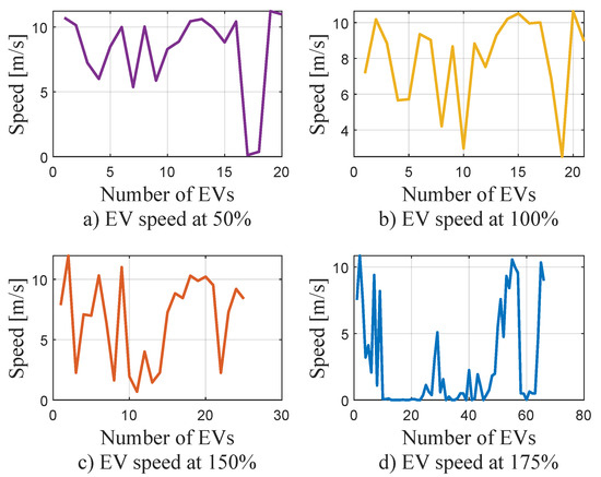 Figure 6, we can see the variation of speed that has the EV along its route from the starting point to its arrival. These metrics show how the traffic load affects the trip; in this case, analyzing the speed, the green metric represents a flow of 50% of very smooth traffic that refers very late at night where the vehicular traffic is light, and the VE reaches an average speed of 8.19 m/s. The blue metric represents a 100% traffic flow with an average speed of 7.96 m/s, found in the morning hours. The magenta metric, therefore, develops in a 150% traffic flow. It can be found in the peak hours of the day with an average speed of 6.69 m/s. Finally, the red metric is developed in a 175% flow of extremely high traffic in which several factors, such as rush hour, traffic accident, and road repair, among other factors, have come together with an average speed of just 2.59 m/s. Thanks to the metrics, we can conclude that the traffic flow directly affects the smoothness of the trip and, therefore, the user’s comfort.