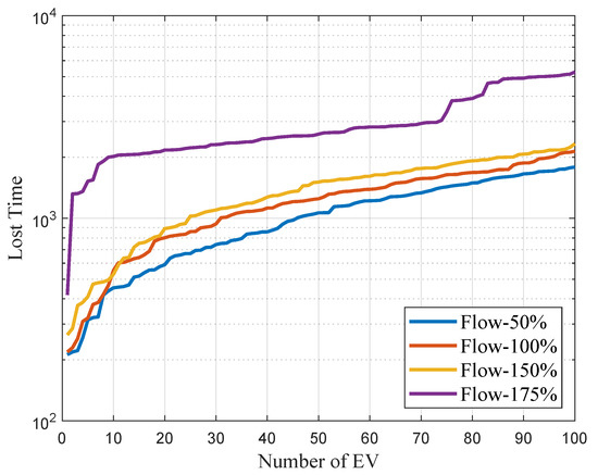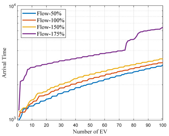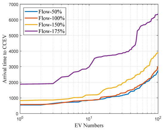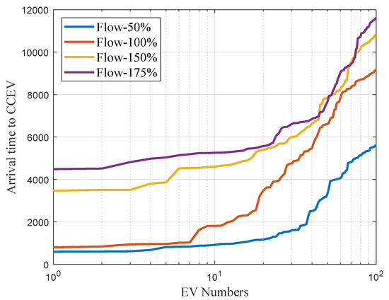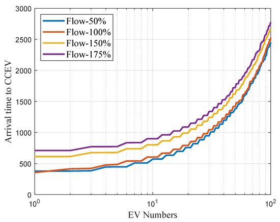 when subjected to increased traffic flow. Therefore, they do not share the same characteristics in the curves because the CCEV are located in different areas, which proves that the travel behavior of EVs is closely related to the road network. When analyzing