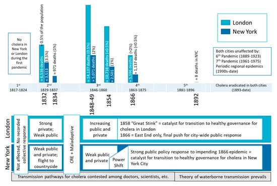 Throughout, we draw examples from the history of cholera (Cholera morbus). Only two strains of cholera have potential for epidemic spread. These have caused seven pandemics to date, as shown in Figure 1 [17,18]. Given space constraints, we mainly focus on comparison between governance of cholera in New York and London, and then link these local-level responses to global public health governance. London is an obvious choice for illustration because it is well-known in public health as the place where John Snow first applied epidemiologic methods in 1848 and again in 1854 to characterize cholera cases by person, place, and time. This enabled him to test the hypothesis that water could serve as a vehicle for transmission. Although his research was not widely accepted until much later, his work identified cholera as a water-borne disease [19,20]. New York was then selected as a point of contrast. Although it followed a fundamentally different approach to managing the pandemic, it ultimately overcame the disease at about the same time as London.