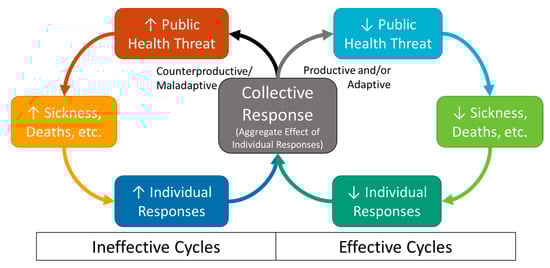 Collective response is “effective” when it is sufficient to reduce the public health threat (as measured by decreased mortality, morbidity and spread of disease), thereby switching the system to the right-hand side of the treadmill. It is important to keep in mind that effective collective responses may only be temporary. Indeed, as Figure 2 shows, when the treadmill is in effective cycles, the health threat declines, threat signals decrease, and therefore productive individual level responses decrease while the potential for counterproductive responses increases. This is known as the crisis rebound effect. If unchecked, the crisis rebound effect will lead to a return to ineffective cycles once the immediate crisis is over. Collective responses are “adaptive” if they include the creation of institutions that counteract the crisis rebound effect, keeping the treadmill on the effective side, and thereby preventing or mitigating future crises. Collective responses can also be “maladaptive” if they create institutions that keep the treadmill stuck in ineffective cycles. Importantly, collective responses that are “effective” in a given crisis may be “maladaptive” in the long term. Although our definitions of “effectiveness” and “adaptiveness” do not consider fairness and equity per se, research and our own analysis consistently show mitigation of public health threats is not possible without addressing the impacts on the most marginalized groups within society [28,29].