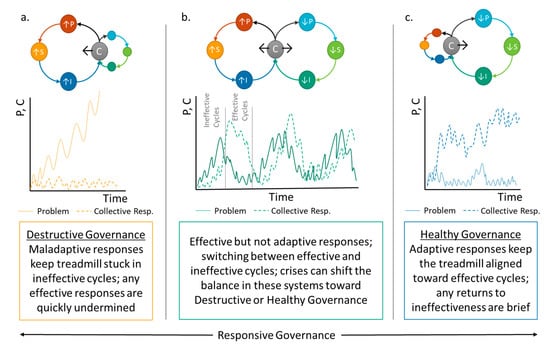 The governance treadmill produces different patterns for different problems in different contexts, as complex dynamics play out [30]. These patterns vary for many reasons, but it is useful to examine some stylized patterns that can occur as the treadmill cycles back and forth between ineffective and effective sub-cycles. At one extreme, if people collectively fail to learn from experience and consistently implement maladaptive responses, the resulting pattern of escalating crisis followed by stagnation or collapse is called “destructive governance” (Figure 3a). At the other extreme, adaptive collective response leads to a pattern of “healthy governance,” which ensures that solutions are maintained over the long run (Figure 3c). Many different patterns can exist between these two extremes, but responsive governance usually leads to some variation on Figure 3b, where the treadmill switches back and forth between the ineffective and effective cycles in response to short-term signals. As a problem increases, people may try easy options first, or they may need time to learn about the effectiveness and/or feasibility of their options. Either way, inaction or less effective responses tend to occur early on. Thus, the system may go through several ineffective cycles before switching into a period of more effective governance. Because response in this example is “effective” but not “adaptive”, collective response dissipates as the problem recedes and the system will switch back to ineffective cycles fairly quickly.