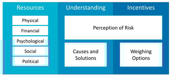 From the scholarly literature, we identify three interdependent capacities that must align for a temporary transition from ineffective cycles to effective cycles of collective response to a given crisis: resources, understanding, and incentives (Figure 4). By “alignment”, we mean that all three are necessary; if one is set in a counterproductive direction, then response will be ineffective, and the system will stay on the left-hand side of the governance treadmill for another cycle. First, everyone must have access to sufficient resources for prevention or, at least, mitigation. These resources include physical capital (e.g., hospitals, manufacturing plants), financial capital, social and political influence/autonomy (e.g., trust, social networks, etc.), and psychological capacity [34,35]. Second, people need a sufficient understanding of the problem and potential solutions to guide their effective use of those resources. Most importantly, they need to recognize their personal threat from the disease and sufficiently understand its causes to accurately identify effective and feasible solutions [36,37]. Understanding depends heavily on past experience [38], the way information is processed [39], social networks and norms [40], media representations [41,42,43] and many other factors described in greater detail below. Third, people must have incentives to actually use their resources effectively. Avoiding harm from the disease is an important incentive, but this is balanced against the perceived costs and benefits of various solutions, some of which allow individual avoidance without benefit to others [44]. This calculation is often undertaken intuitively and is influenced by emotional factors such as loss of personal identity and social factors such as the perceived fairness of outcomes, as well as economic factors such as gains or loss in utility [39,45,46,47,48,49,50,51,52].