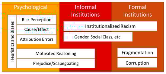 Psychological barriers are also shaped and reinforced by informal socioeconomic and political institutions that keep power disconnects wide. These have been studied in several literatures and have been shown to undermine the long run effectiveness of public health efforts. For example, Jones [29] provides a framework for identifying the structural causes of “race”-associated differences in both communicable and non-communicable diseases within a larger socio-political context. She defines institutionalized racism as “differential access to the goods, services, and opportunities of society by race; a form of racism that is “normative, sometimes legalized, and often manifests as inherited disadvantage… having been codified in our institutions of custom, practice, and law, so there need not be an identifiable perpetrator. Indeed, institutionalized racism is often evident as inaction in the face of need” [1,29,116,117].