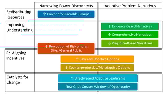 From the above examples, we can see that there is not a linear progression in the transition to healthy governance. Each cycle of the treadmill brings opportunities to overcome barriers and reset the precursors to governance. This includes changes that occur between crises, in latent phases of the treadmill, when people have a chance to foster more gradual and sweeping systemic changes such as inventing easier yet effective solutions to a problem (e.g., Bazalgette’s sewage innovations, Hall’s political entrepreneurship) and organizing to demand greater political or economic influence. Problem narratives, too, may change between crises, through learning and generational shifts. Most important, reinforcing feedbacks between more adaptive problem narratives and narrower power disconnects can lead to adaptive transitions, particularly when catalyzed by effective and adaptive leadership at the beginning of a new cycle of the treadmill.