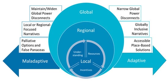The last area to examine in transitions to healthy governance is the importance of scope and scale. Intuitively, public health threats that are spread over a larger area and/or that affect more people usually require more resources for prevention, all else equal. On the other hand, when risks are widespread it may be easier to mobilize resources because risks are more evenly distributed, which narrows power disconnects by giving the people who control resources an incentive to use them more equitably. Our point here is more nuanced, however. Assessing the transition to healthy governance depends heavily on the scope of the threat and the scale of analysis. In other words, responses that are adaptive for one type of health threat in one geographic location may be maladaptive for other types of health threats and/or other areas of the world. Figure 7 highlights this concern and shows how local-level treadmill dynamics can either lead to adaptive or maladaptive global dynamics depending on the impacts on power disconnects, problem narratives, and response options (paralleling Figure 6).