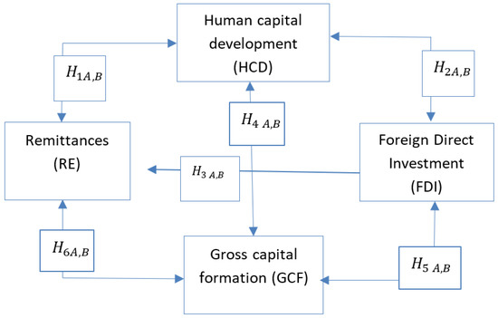 Referring to the existing literature focusing on human capital development, and in the process of empirical investigation, researchers have investigated the determinants and critical role of remittances in economic progress. However, the impact of remittances on human capital development is not conclusive because the role of remittances varies with the economic structure of the recipient’s economy. Furthermore, as far as other key determinants, the existing literature has yet to establish conclusive evidence focusing on top remittance-receiving economies. Therefore, we tried to establish a bridge and explore fresh evidence with this study. The motivation of the study is not to explore the key determinants, but rather to gauge the role of remittances in the process of human capital development in the top 10 remittance recipients with the process of foreign direct investment gross capital formation. According to the existing literature, very scanty empirical evidence has been produced to explain the hypothesis that FDI leads to human capital development and gross capital formation-led human capital development. This study extends the existing literature in human capital development through the channel of FDI and gross capital formation with remittances’ predominant role. Furthermore, the study has proposed the hypothesis shown in Figure 2 in detecting the directional association between REM, FDI, GCF, and HCD.
