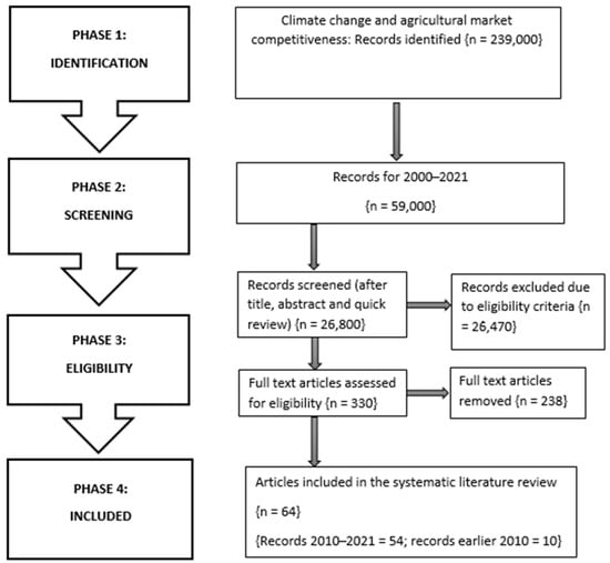 During the first phase, we used the keywords of climate change and agricultural market competitiveness. A total of 239,000 papers appeared. We cut down the search to 2000–2021 during the second phase. As a result, 59,000 articles appeared. During the third phase, we identified 26,800 papers. There was a brief title and abstract evaluation of the records. After evaluation, the papers that did not satisfy the eligibility criterion numbered 26,470, and we excluded them. A total of 330 articles were found to be relevant to the current study. After a detailed review, we removed 238 of them, and the remaining 64 most relevant studies were included (Appendix A).