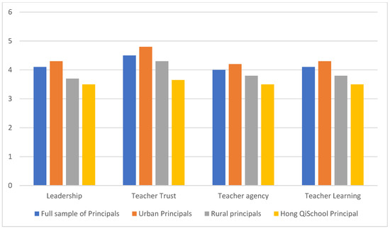Comparison of urban, rural, Hong Qi principals on the four constructs.