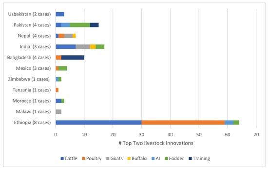 Figure 2 displays the Top Two innovations for women by country and category (livestock species, type of intervention—artificial insemination (AI) and fodder—and capacity development) and reveals livestock to be widely recognized as important for women’s livelihoods. The FGD testimonies indicate that improved dairy cattle are important for women in many cases from South Asian countries, Morocco, and across the six Ethiopia cases. Improved poultry breeds also appear often among the top rankings for women in Ethiopia, and improved goats emerge in cases from Nepal, India, and Malawi.
