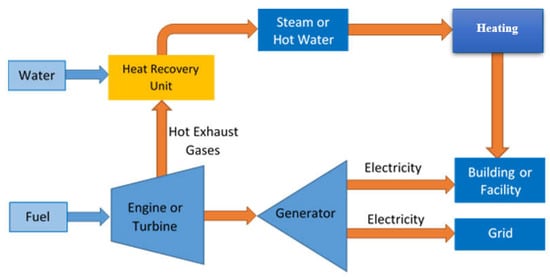 Gasification is a remarkable technology that is used to produce energy from different sources, e.g., waste, biomass, agricultural and industrial residues. It also plays a vital role in reducing GHG production globally [4]. Another form for generating energy from waste with the ability to utilize the maximum amount of heat generated is combined heat and power (CHP). The CHP process produces power, and during the process of power generation, it utilizes the heat generated in different sources, e.g., boilers and heaters. Conventional sources of electricity production produce heat, which is normally wasted through the atmosphere. Large power stations contain cooling towers that dissipate the excess heat, resulting in lower efficiencies of such a plant compared to modern CHP plants. Typical gas/coal-fired power plants have efficiencies of 40–50% compared to 80% efficiencies of CHP plants, which use wasted heat [5]. CHP plant exports heat or even cooling powers in factories and local buildings for industrial and residential purposes. The electricity produced from conventional power plants is distributed over the national grid with losses in energy/power due to transmission and distribution (~7–9%) [6]. On the other hand, CHP is not expecting losses in energy transfer because the power is locally generated, and the waste heat is usually recovered (Figure 1). Consequently, the technology is more advantageous and has higher efficiencies in electricity and heat distribution [7].