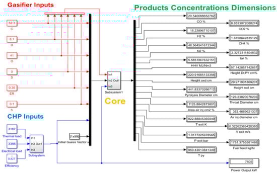 Under Matlab environment, the kinetic model for a downdraft gasifier was built in by Salem and Paul [4], which incorporated detailed chemical kinetics for every zone within the gasifier, enabling an estimation of the working parameters of a downdraft gasifier. By entering the ultimate analysis, the model can predict the optimum gasifier design, tar content, and the concentration of producer gas. For the current research, the MATLAB code developed was converted to a user-friendly Simulink model, as shown in Figure 2, and then integrated with the CHP model also developed using Simulink. The kinetic model was previously validated against numerical and experimental data over a wide range of feedstocks under different working conditions and found a good agreement [4]. As a result, no further validation is stated in the current research.
