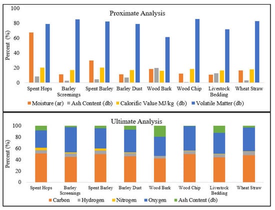 Table 1 illustrates typical results for the ultimate and proximate analysis for different conventional biomass materials. Comparing the current agricultural feedstocks with the biomass materials, they have similar properties and, hence, the ability to be gasified within a specific range. For example, the volatiles and fixed carbon (FC) content are important components in any gasification process. When both types of feedstocks are compared, they have values of volatiles around 80%. On the other hand, moisture content level, which affects the quality of the gasification process, has always been considered. Higher values of moisture require more energy for removal (spent hops and spent barley feedstocks). All the other feedstocks have lower MC levels <20%, which again lies in the normal range of typical biomass.