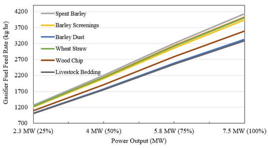 Generally, as seen in this figure, increasing the fuel feeding rate constantly increases the power output as per the relation presented in Equation (2). The spent barley sample, which requires the highest feeding rates to achieve the same required power while wood bark consumption, is the lowest due to the higher heating value considering its elemental composition; see Equation (4).