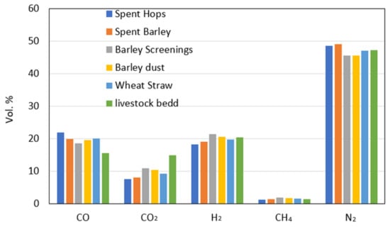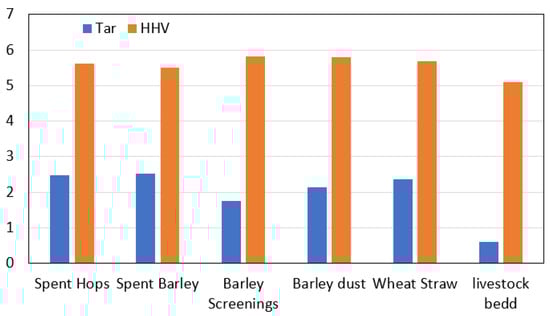 Figure 7 shows higher heating values for barley dust and barley screenings (~5.8 MJ/Nm3) with a low tar content of around 2% from the producer gas mole content. This is due to the relatively higher amount of C and H presented in these two feedstocks that enhanced the production of producer gas composition. Further, tar conversion is another important factor that resulted in the production of light compounds resulting in tar reduction. On the other hand, the lowest heating value is found for livestock beddings (5.1 MJ/Nm3), which have the lowest amount of carbon with a high ash content (Figure 4). Lower carbon content in a feedstock tends to decrease the corresponding char oxidation reactions. As a result, it decreases the amount of CO and CH4 produced and hence lowers the heating values. The highest tar levels are found in spent barley, followed by spent hops (2.53% and 2.49%, respectively). This is because their lower oxygen content tends to decrease the oxidation reactions, resulting in a lower temperature in combustion, lower burning and cracking rates for tars, and hence, higher amounts of tar.