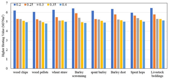 Similar values for the HHV for most of the feedstocks were found. However, the barley dust, barley screenings, and livestock bedding prove to have the highest values (~6.4 MJ/NM3). Based on their ultimate analysis, such feedstocks require lower air amounts to achieve the same Φ compared to other feedstocks. As a result, they produce more values of CO, H2, and CH4 (Figure 6) and raise expectations of heating value. However, as previously noted, all materials exhibit the same trend and very close values to heating value production, which is comparable to woody biomass materials (e.g., wood chips). The results, therefore, demonstrate that using agricultural waste materials in gasification gives potential results.