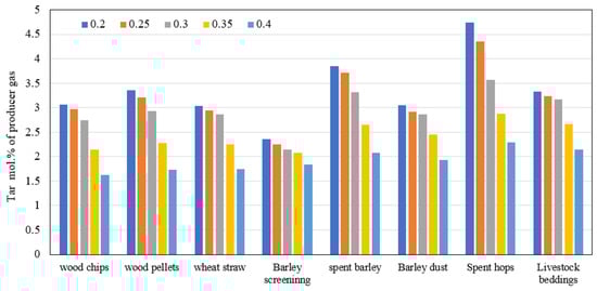 Furthermore, Figure 9 shows the effect of changing Φ on producer gas quality (including prediction of tar amounts). Fixed MC levels of 10% were used while varying the Φ. Higher Φ (air amounts) leads to more turbulence, higher temperatures, and higher oxidation reactions rates [34,36]. Consequently, this increases tar cracking, converts it to lighter compounds, and reduces tar amount in producer gas. For wood pellets, while increasing the equivalence ratio from 0.2 to 0.4, the tar concentration decreases rapidly by 50%, which find a strong agreement with [4,35]. However, as seen in the figure, while increasing the equivalence ratio between 0.2 and 0.4, the tar concentrations fall between 29 and 51% for the selected materials.