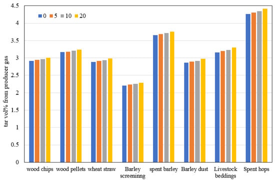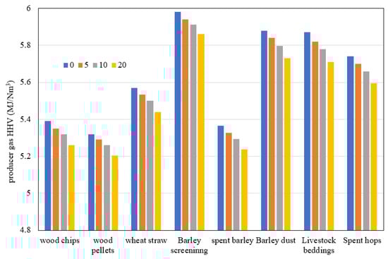 The effect of changing MC on producer gas quality (heating value and tar content) is addressed in Figure 10 and Figure 11. The simulations are run at a fixed (Φ = 0.25) while varying the MC values between 0 and 20%. Higher levels of MC decrease the corresponding heating values, as clearly shown in Figure 10, resulting in lower gasification efficiency. The higher levels of MC in a feedstock will require more energy (heat) for removal, thus affecting the oxidation and gasification reactions. This accordingly dilutes the amounts of syngas yield because of higher moisture content and, as a result, lower the heating value. The results indicate that decreasing MC from 20 to 0% leads to an increase in HHV by 1–4% for the selected materials. Barley screenings, barley dust, and livestock beddings thus produced more concentrated syngas and correspondingly higher heating values.