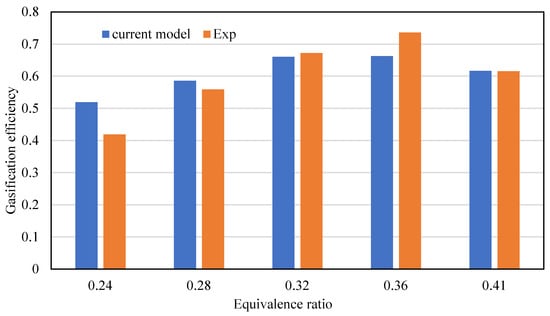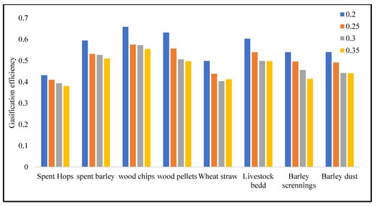 The same working conditions for comparison and the predicted gasification efficiency were found in good agreement with that of the experimental results at the various Φs [35] (Figure 12). Following this satisfactory validation, the gasification efficiency for the different feedstocks with an impact of the Φ is presented in Figure 13.
