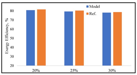 A comparison between the current model exergy analysis and the previous work of [38] is illustrated in Figure 14. The results are carried out for the same feedstock (solid residues, mixture of MSW) for different MC levels, as shown in the figure. The results demonstrate a fairly good agreement between the current model and previous work with negligible variations.