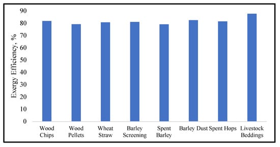 The data demonstrated in Figure 15 show different exergy efficiencies for the feedstocks of the current study. Compared to wood biomass materials, the agricultural feedstocks show similar results as previously discussed for the HHV and producer gas composition. Such similarity was expected because of the similar analysis and composition of the selected materials. The second law analysis was estimated at fixed Φ of 0.3, while MC = 10% as suggested for better performance of the gasification process, as previously illustrated in Section 4.2. The highest value for exergy efficiency was noted for livestock beddings (~87%) because of the higher syngas yield.