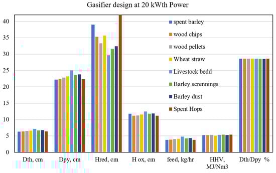 For a 20 kW gasifier design, the set of results presented in Figure 16 shows the main gasifier dimensions, the corresponding feeding rate, and the heating value of producer gas. Except for the length of the reduction zone, which varies between 29 and 42 cm, the results indicate homogeneity in other dimensions. However, the designed kinetic code considers the optimum height of the reduction length/height for a full char consumption. Consequently, increasing the height of reduction has no effect on syngas production or the gasifier power. Additionally, a slight/negligible variation for the pyrolysis/firebox diameter, throat, and oxidation area height was found.
