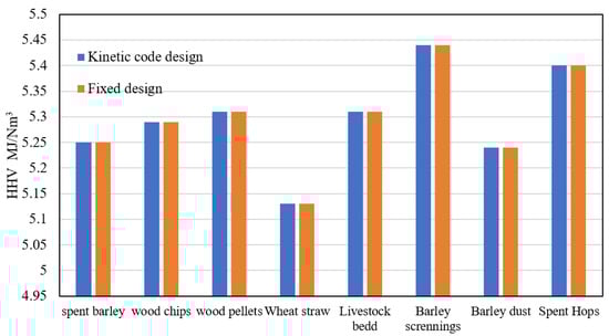 On the other hand, they have a moderate value for the other design dimensions of gasifiers based on the fixed power rate. To prove this point, the optimal producer gas HHV for the different feedstocks in Figure 16, calculated using the kinetic model, was compared to the producer gas HHV that would be produced by these feedstocks if the gasifier was designed using the dimensions and parameters for spent barley (Figure 17).