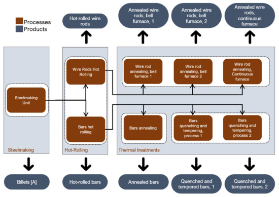 This plant is articulated into three Production Units (PU). The steelmaking unit produces steel billets, which are either directly sold to the market or undergo the hot-rolling unit, which heats up and then mills the steel, producing either hot-rolled wire rods or hot-rolled round bars. Again, these hot-rolled products may be directly sold to the market or undergo further thermal treatments, which are divided into annealing of wire rods (three different products) and round bars, and quenching and tempering of round bars only (two different products).