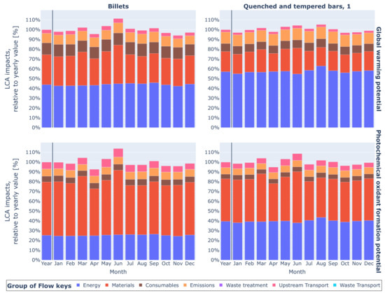 Temporal dynamics in the Life Cycle Inventory (LCI) may happen both at the level of primary or secondary data. Primary data are defined as data directly collected within the LCA study, while secondary data are used when the former are missing [22]. In the industrial context, primary data are generally collected from the production facility under study, which constitutes the foreground system of the LCA. In contrast, secondary data are generally employed for the background system of the LCA, i.e., processes outside the boundaries of the production facility, such as the supply chain of raw materials used for manufactured products. Still within the industrial context, the generation of LCAs is scarcely automated, with the chosen time resolution being generally much greater than the product or process lead time [23]. This means that primary data from production processes are collected at a low frequency and LCAs are computed relatively to the cumulated production, obtaining results for an average product related to a yearly time horizon, which coincides with the yearly temporal resolution of the study. As a consequence, LCAs in industry do not point out the details of the single products, which can yet vary over short time scales [17]. Therefore, static LCAs may not reflect in a satisfactory way the reality of industrial processes, reducing the already limited awareness of decision makers about possible efficiency improvements of production and trade-offs between costs and environmental benefits [15,16]. In addition, the difficulty concerning retrieving high temporal resolution primary data which can be readily used to identify hotspots and trade-offs discourages the systematic and periodic use of environmental assessments within quality management systems in industry [24,25].