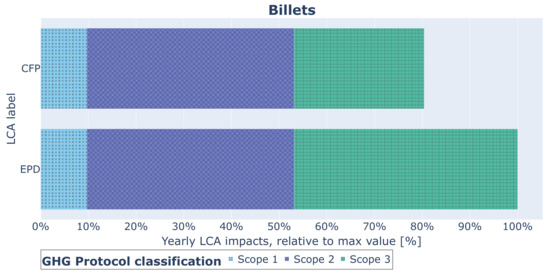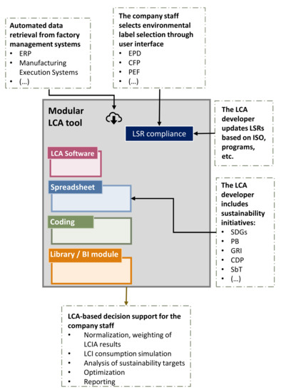 Relevant enterprise-software companies are developing automated digital platforms, e.g., for carbon accounting, reporting and environmental impacts reduction [54]. Similarly, Ferrari et al. [24] outlined that an opportunity for overcoming the barriers to LCA diffusion in industry arises from factory Enterprise Resource Planning (ERP) systems. Indeed, these systems retrieve most of the data useful to build the foreground system of the LCI. Analogously, Meinreken et al. [55] computed yearly-level Key Performance Indicators across the entire value chain for 3337 products of a company, with estimated savings of about 200 years full-time equivalent with respect to conventional LCAs. In the steel sector, Moon et al. [56] developed a specific package to automatically perform LCAs due to its connection with the ERP, the environmental management system and an energy server system of the company. They found this method was superior to manual data gathering, considering time, costs and data reliability. Indeed, after the development of a first LCA model and the construction of this infrastructure, the latter can substitute both the company resources to manually look for the data and the LCA practitioner to process these data, apart from infrastructure maintenance and updates, thus lowering costs and time [24]. Moreover, primary LCI data consistently linked to an LCA tool can be dynamically updated at higher temporal resolutions, theoretically up to monitoring a single product batch in a real-time shop-floor LCA [25,57], even in connection with simulation models [2]. iPoint [58] developed a tool to highlight and analyse product batches associated with lower environmental impacts, too. As outlined in Section 1.2.1, by refining the temporal resolution of the LCA study, it is then possible to disclose the variations of LCA results related to changes in the renewable energy supply [2], in configurations/efficiencies [23] and in recycled materials use [25]. Finally, LCA tools may be conceived in a modular way [23]. This means that after identifying all the emissions and consumption patterns, a distinct LCA calculation for each flow is carried out, and eventually all the LCA modules are aggregated into the total burden, enhancing the flexibility of the LCA tool.