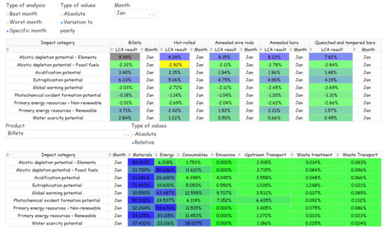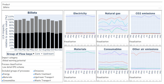 This module manipulates the wrangled data and information provided by the Spreadsheet module by means of a coding language, which is python in our case. Here, LCA results are computed for every flow, for all products, impact categories and timesteps, also outlining the contributions of different flows. Coding provides the possibility to work with a high amount of data, only through a few simple rules and equations which keep the code manageable. In our case, we managed 155 consumptions/emissions data (those related to steelmaking, which are common across all products, accounts for 100 of them), 9 production data (9 products shown by Figure 1) 37 indicators from EPD and ILCD methods, 12 timestamps (12 months in a year) and different Mapping information. Furthermore, with a Coding module, if either new classifications are added in the Mapping information (columns in Table 2), or new flows are monitored (rows in Table 2), the code structure does not change.