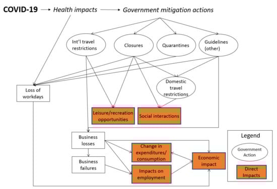 Direct Impacts: the direct impacts of the COVID-19 pandemic and response measures, as identified in previous studies [3,36].