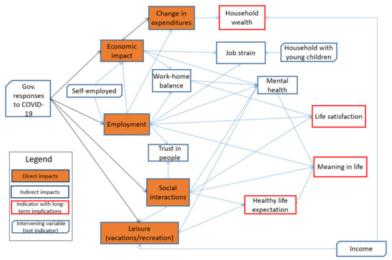 Previous studies identified the connections between COVID-19, the measures undertaken to limit its impacts, and wellbeing indicators [3,36]. In essence, these studies track the impacts of the pandemic by first identifying the health effects of COVID-19 and the impacts of measures implemented to curb the pandemic’s spread. These impacts are then traced to variables that affect wellbeing indicators or the direct impacts on such indicators. Thus, the impact of the pandemic and response on wellbeing is identified by the extent to which they impact wellbeing indicators. This is depicted visually in Figure 1.