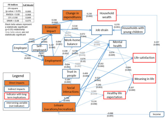 The results of the full SEM model are presented in Figure 3. In this figure, indicators with long-term implications are marked with a red border and indicators with impacts felt in the short-term are marked with a blue border. Intervening variables (which are not indicators of well-being) are marked with cut corners. Black beta values represent a statistically significant (p < 0.05) relationship, while grey beta values are not statistically significant.