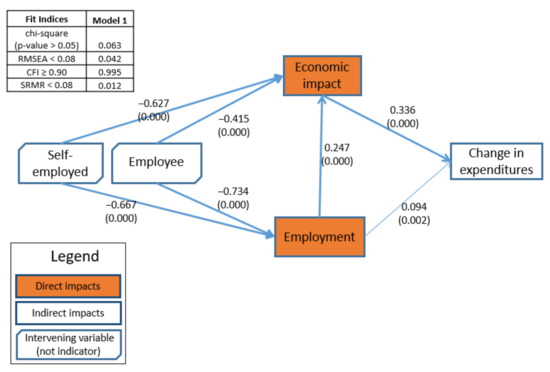 Some of the strongest associations in the model are: the positive impact of social interactions on both mental health and life satisfaction, the negative influence of being self-employed on economic impact, the influence of employment on changes in household expenditures, the influence of economic loss on expenditures, and the influences of having children and incurring economic loss on increases in work-related stress.
