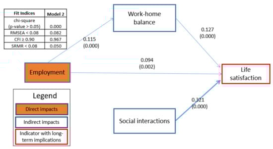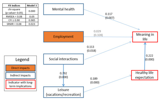 Several partial models demonstrate the relationships between specific variables of interest. Models 1–4 are presented in Figure 4, Figure 5, Figure 6 and Figure 7. Model 1 (Figure 4) shows employment effects and economic loss (comparing employees to self-employed respondents) and connects these to effects on spending habits. In it, we see that while salaried employees suffered slightly higher employment losses, self-employed earners incurred greater economic loss. Furthermore, economic loss affected expenditures. This can be explained by less complicated procedures for obtaining government benefits following loss of employment for salaried employees, as compared with the difficult process faced by self-employed earners. Thus, self-employed earners continue working despite suffering higher economic losses. Model 2 (Figure 5) examines the effects on life satisfaction. It finds that reduced social interactions had a larger influence on life satisfaction than employment and worsening work-home balance. Model 3 (Figure 6) shows that meaning in life is influenced by mental health, social ties, vacationing (indirectly), employment, and expectations to live a healthy life. It is interesting to note that in both Models 2 and 3, mental health and social indicators have a greater effect than do economic or employment indicators.
