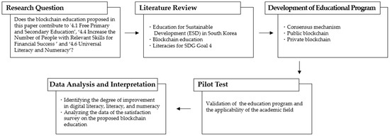 The purpose of this article is to provide a momentum that can facilitate the fulfillment of the sustainable development goals with the blockchain-themed education program proposed herein. To that end, a research topic is defined to begin with. The research topic is focused on Goals 4.1, 4.4, and 4.6 among the seven topics of SDG4 that Korea needs to fulfill with relative urgency. Therefore, the research topic is documented as, ‘Does the blockchain education proposed in this article contribute to SDG Goals ‘4.1 Free Primary and Secondary Education’, ‘4.4 Increase the Number of People with Relevant Skills for Financial Success’, and ‘4.6 Universal Literacy and Numeracy’?’.
