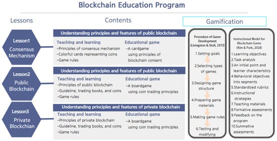 Fourthly, an education program based on learning games was designed in a blockchain-education-related study. Three learning games were developed for blockchain learning, and an education program consisting of three lessons was developed around the games.