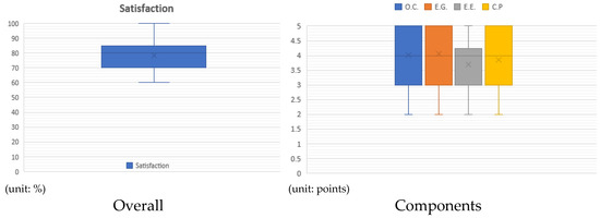 The Pearson correlations across sub-elements of the satisfaction with blockchain education were found between O.C. and E.G. and O.C. and C.P. The entire satisfaction score had static correlations with all sub-elements (Table 4).