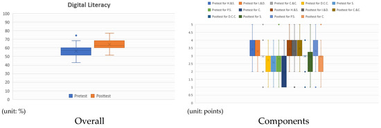 Secondly, the digital literacy measuring tool was developed in reference to the framework of the digital literacy measuring tool designated by UNESCO, with questionnaires designed to be comprehensible by elementary students [29]. It is a 5-point Likert scale and the tool covers seven different areas, including the fundamentals of hardware and software, information and data literacy, communication and collaboration, digital contents creation, safety, problem solving, and career-related competencies. The area of career-related competencies covers capabilities and competencies for operating hardware or software, allowing for flexible modification, depending on the competencies of jobs using digital technologies. Thus, that area was changed to include questions on the understanding of blockchain technology in this research. The Kaiser–Meyer–Olkin (KMO) value of the tool was 0.874, with Bartlett’s test result p = 0.000, which vouches for strong validity. Furthermore, its reliability was verified with Cronbach’s α = 0.816.